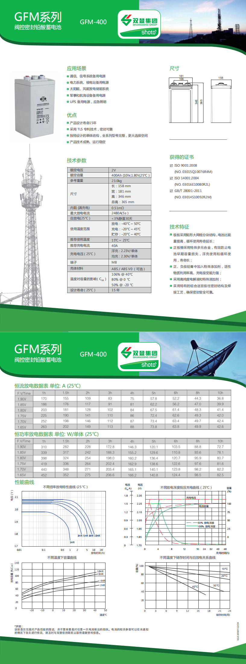 产品描述:“双登”GFM系列阀控密封铅酸蓄电池,是双登采用当代最新技术开发的产品,产品符合国家工业和信息化部 YD/T799-2010 标准。该产品可广泛应用于电信、移动、联通、铁道、船舶等各种通信、信号系统的备用电源,电力系统、核电站的备用电源,太阳能、风能发电储能系统,以及UPS、应急照明等备用电源。